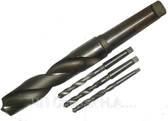 Сверла спиральные с коническим хвостовиком применяются для создания отверстий в различных деталях при помощи стационарных станков. ГОСТ 10903-77 предусматривает выпуск сверл с коническим хвостовиком от 5 до 80 мм. Благодаря коническому хвостовику увеличивается площадь поверхности контакта сверла со сверлильной головкой, что позволяет увеличить точность и повышает надежность крепления. Сверление отверстий диаметром более 25 мм рекомендуется проводят в два этапа. Сначала делают отверстие меньшего диаметра, а потом его рассверливают его до требуемой величины.